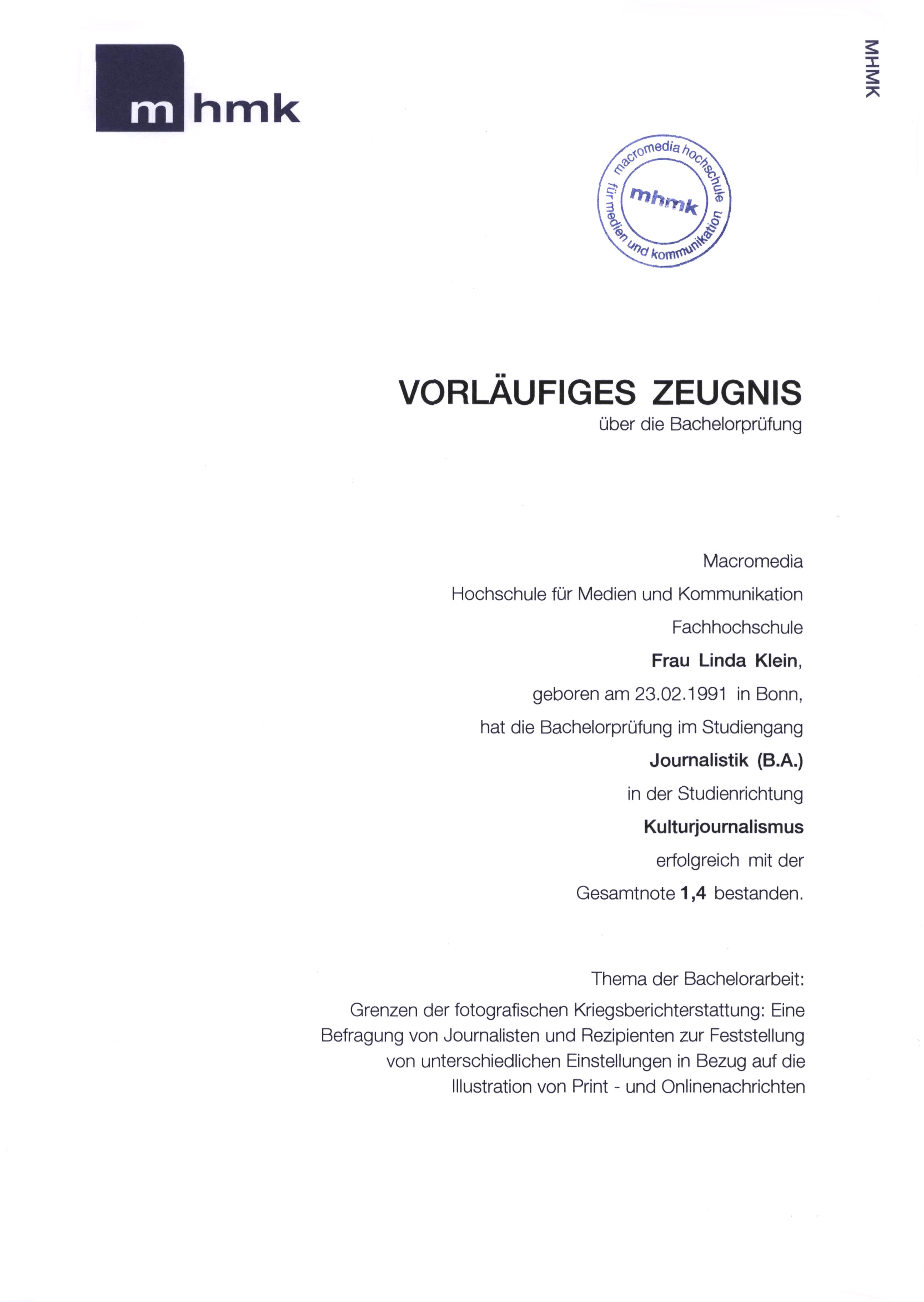5. April 2014 von Linda Katharina Klein Bachelor-Zeugnis Seit März 2014 trage ich den Titel ‚Bachelor of Arts‘.